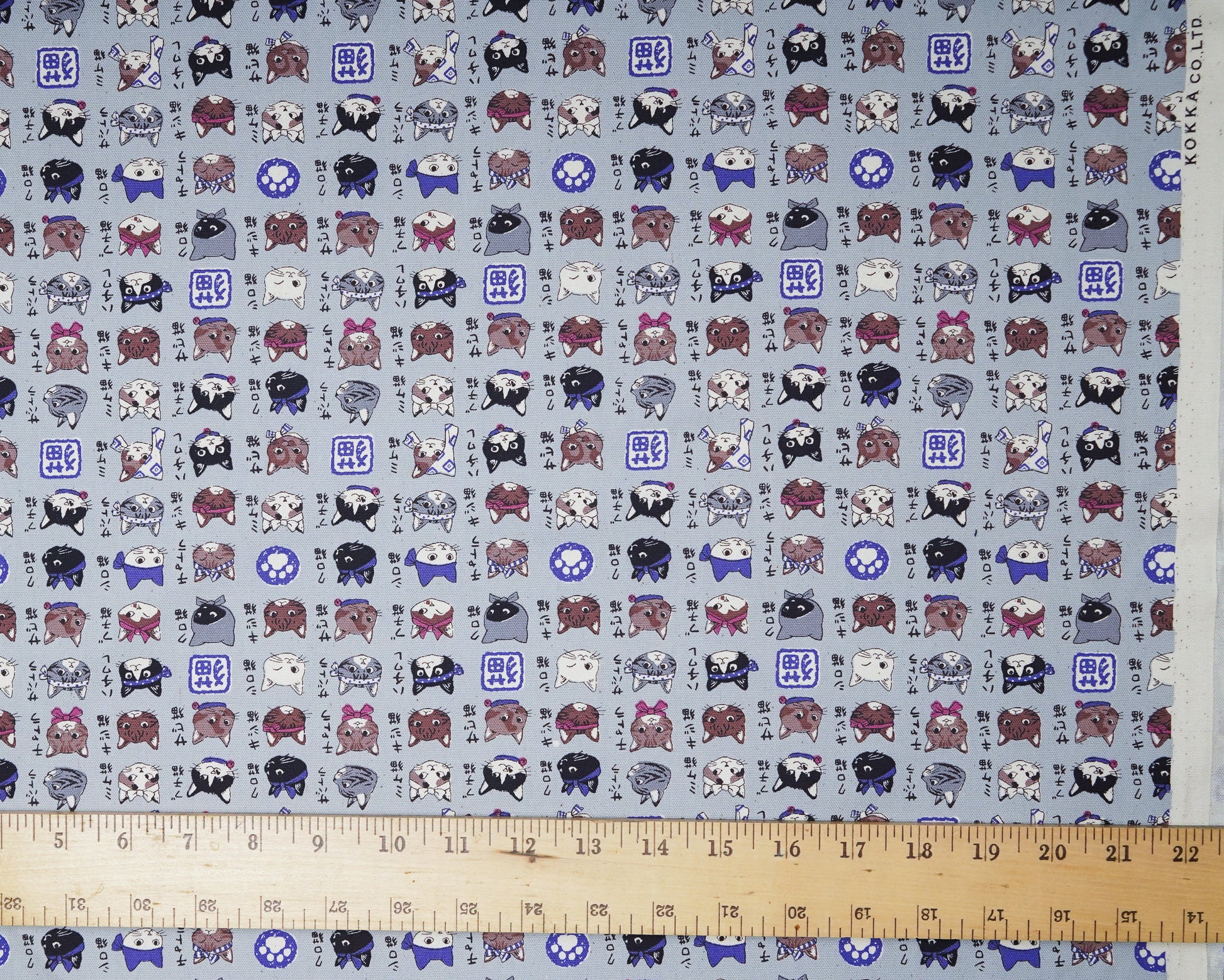 Bandana Cats and Kanji on Gray - Oxford Fabric - Kokka