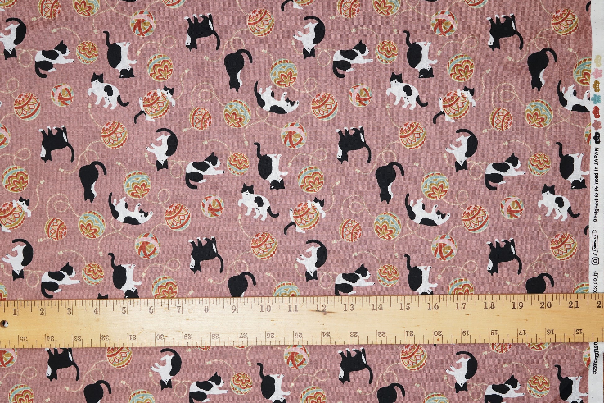 This cotton fabric features cats and temari balls set on a solid dusty pink background. Suitable for quilting, home decor, bags, accessories, and more!