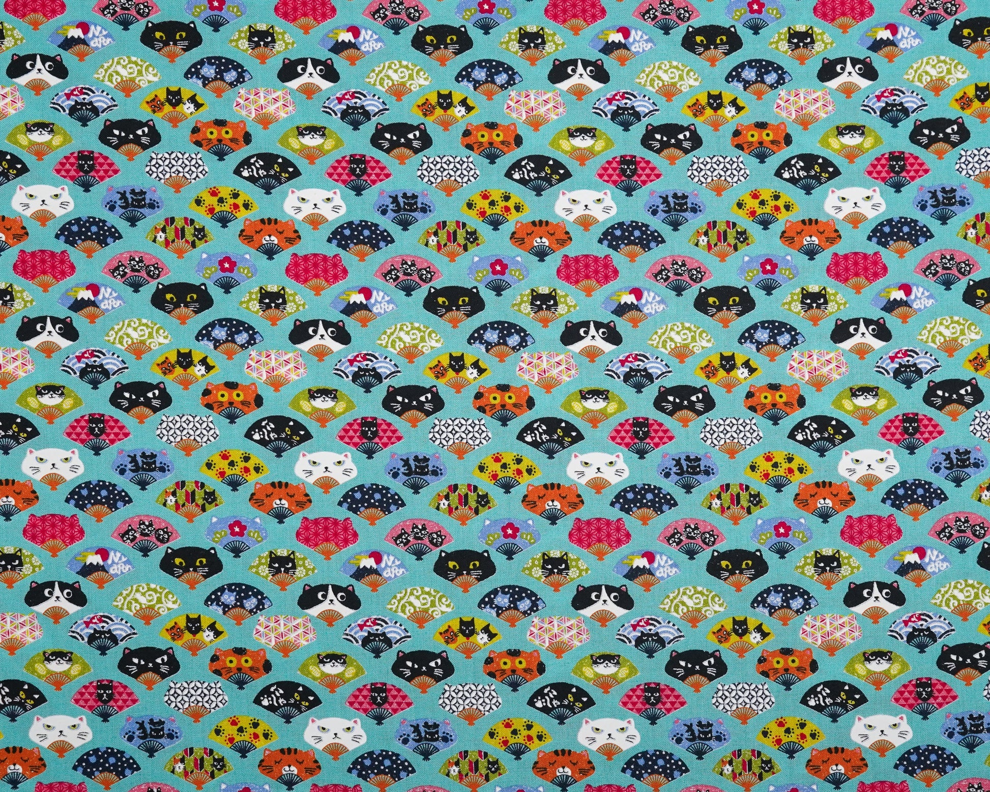 Fans with Cats on Teal - Cotton Fabric - CoCo