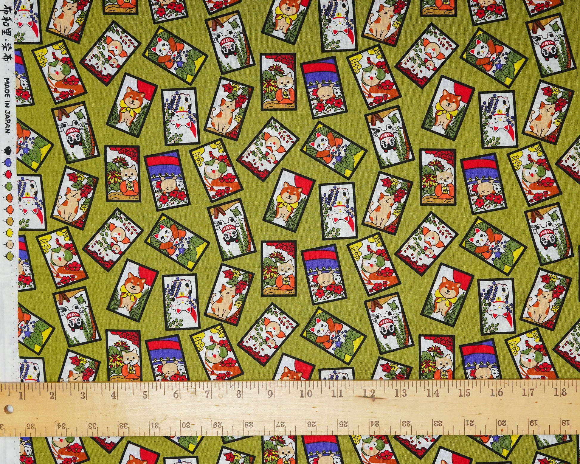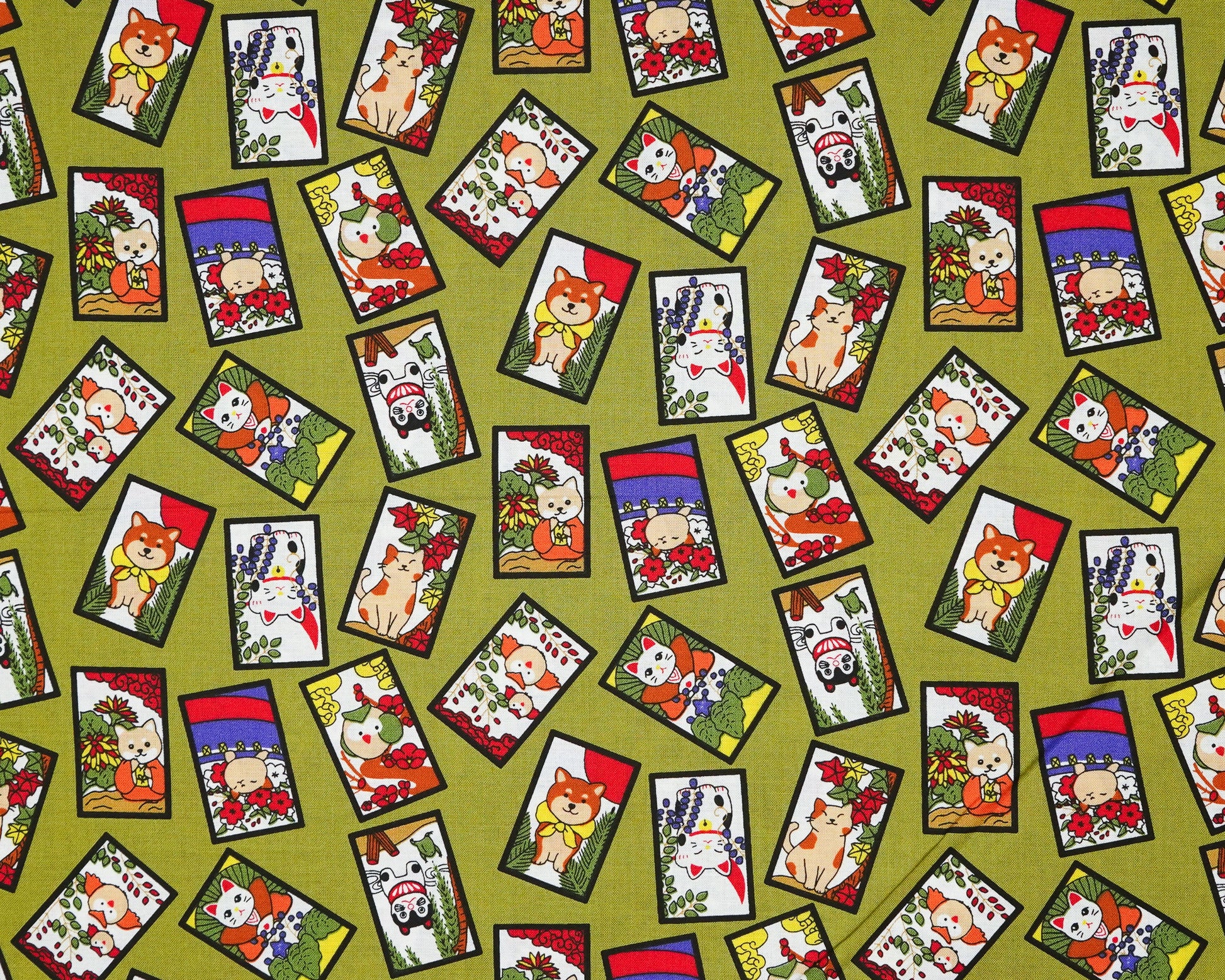 Kawaii Animals Hanafuda on Olive - Cotton Fabric - Asano