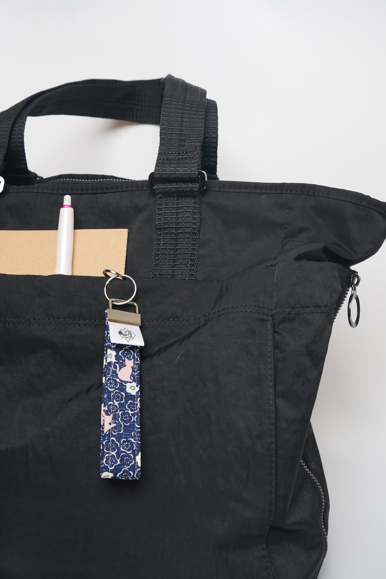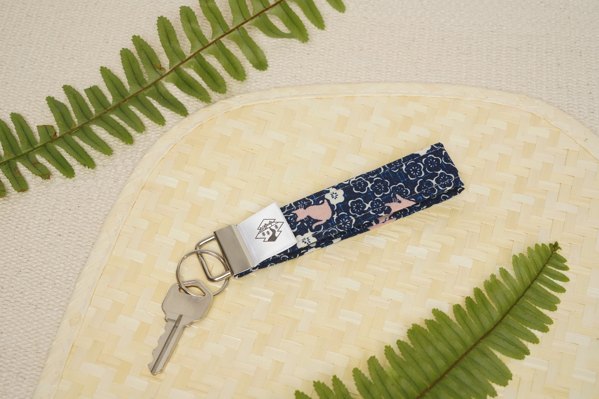 This key fob features pink kitty cats on a bed of navy and white plum blossoms.