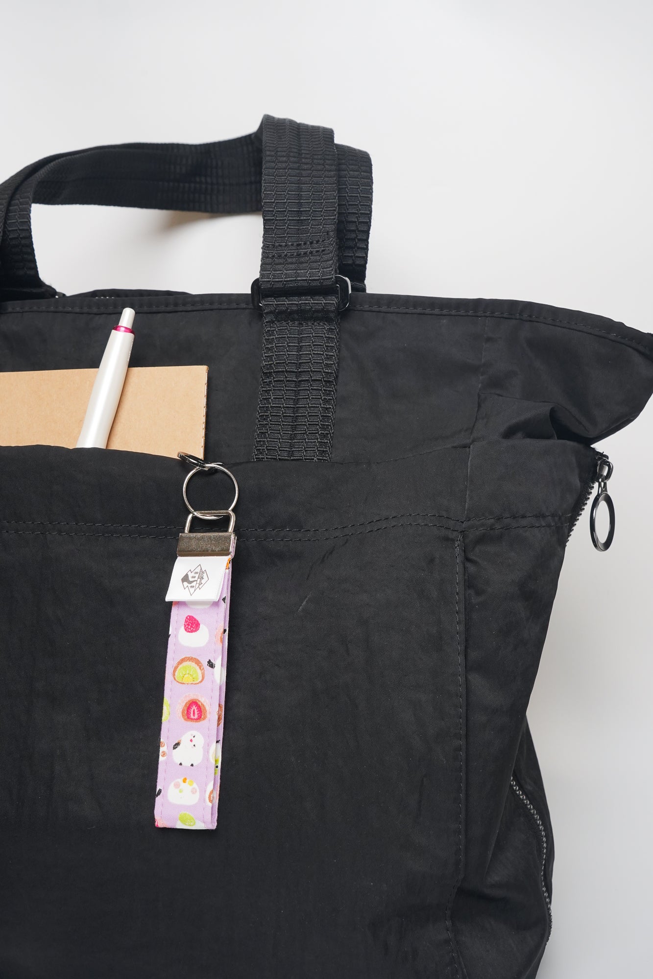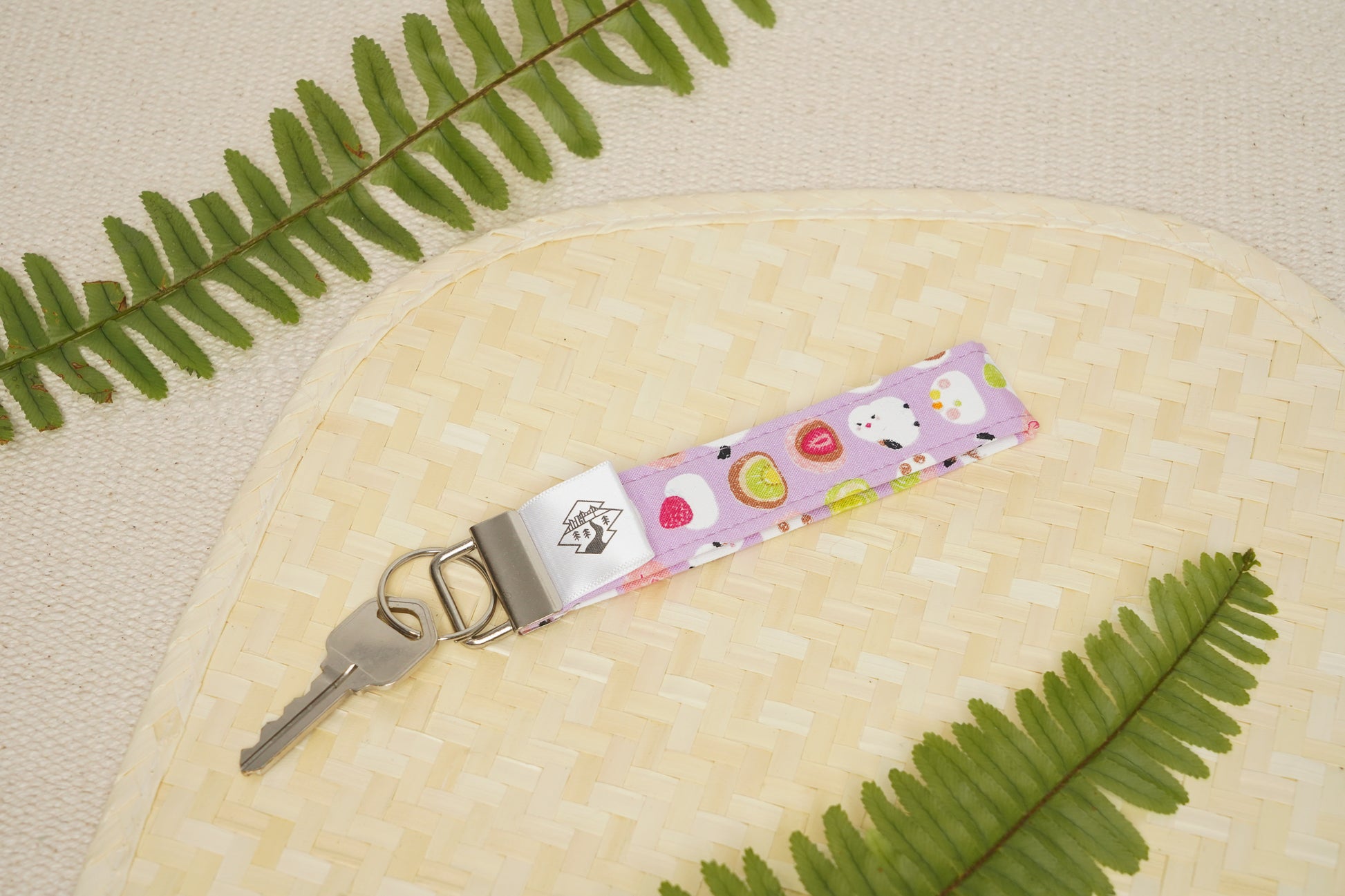 This key fob features an assortment of fruit mochi (a Japanese sweet) and snow birds on a lilac purple background.
