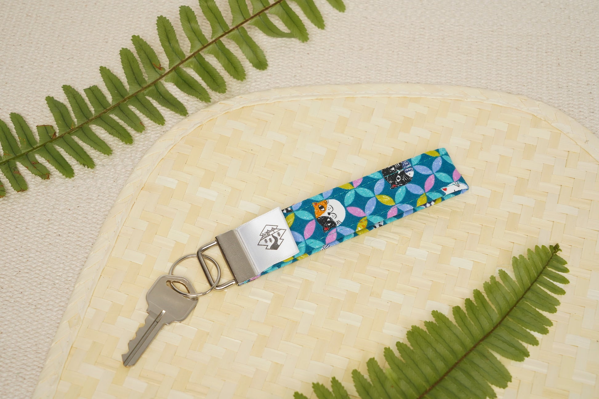 This key fob features cats and fishies amid a shippo print on a teal background.