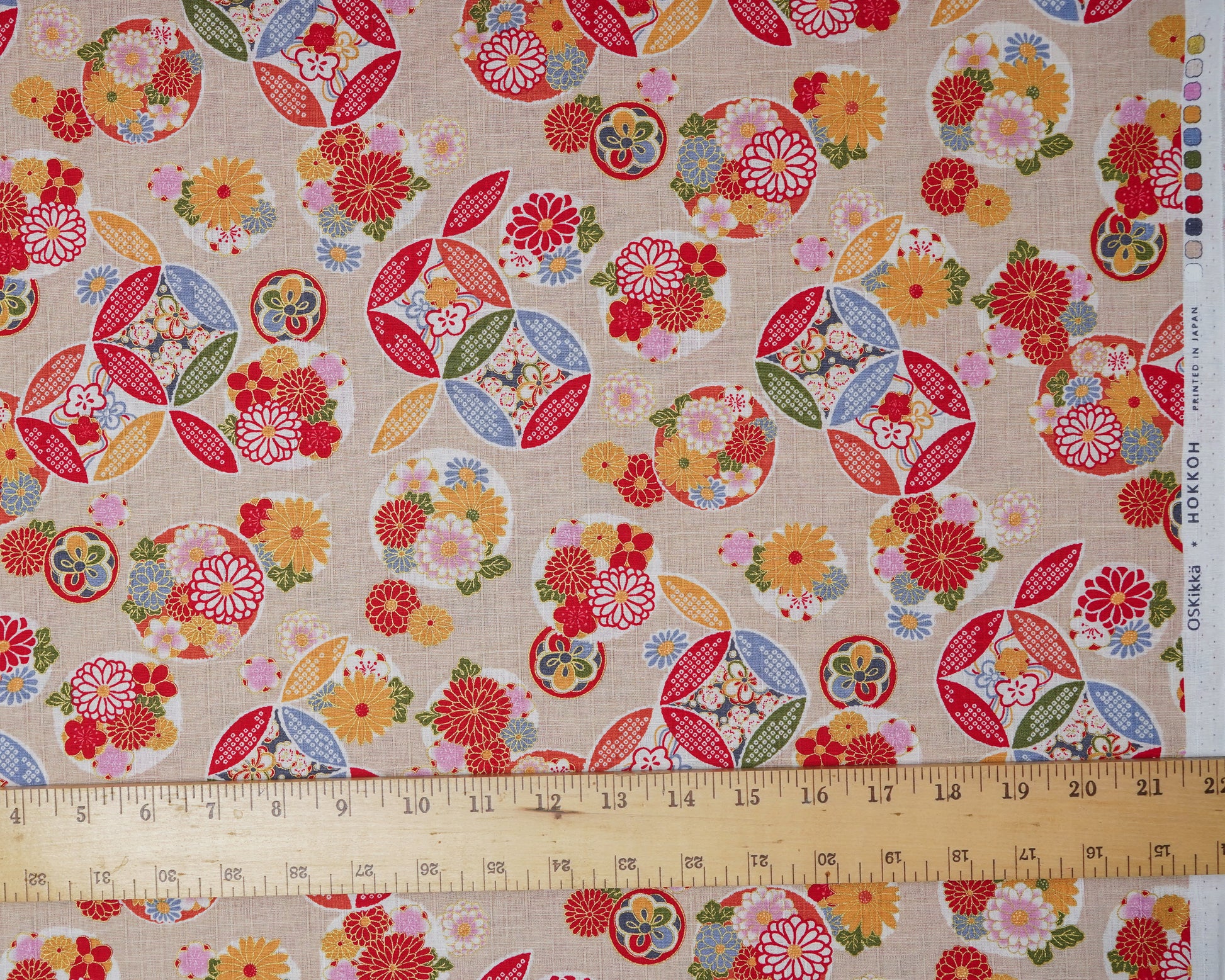 This gorgeous beige-cream dobby fabric from Hokkoh features florals and shippo in vibrant red and pops of blue, green, and yellow.